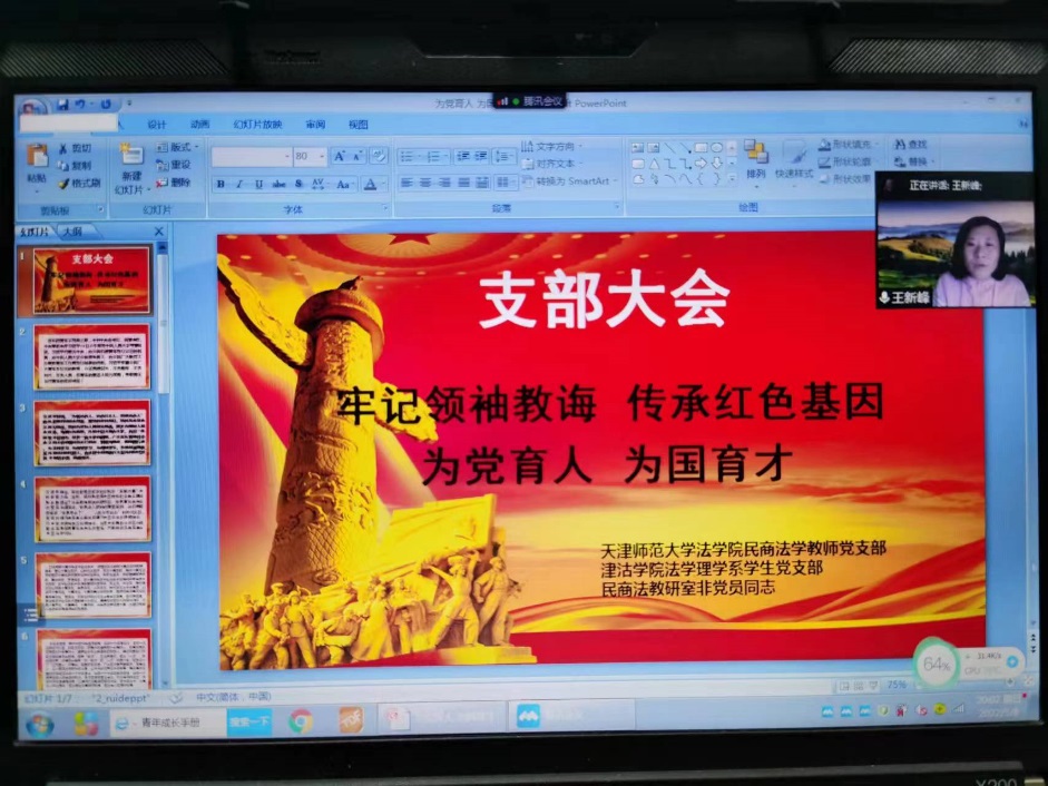 2022年5月8日晚上,yl7703永利集团民商法学教师党支部、津沽学院法学理学系员工党支部联合组织了以“牢记领袖教诲,传承红色基因,为党育人、为国育才。”为主题的党员活动,本次活动有8名支部党员同志和2名受邀的非党员同志参加。会上,重点学习了习近平总书记近期考察中国人民大学发表的重要讲话精神,大家学习热情非常高涨,积极交流发言,围绕总书记的讲话内容发表了心得体会。