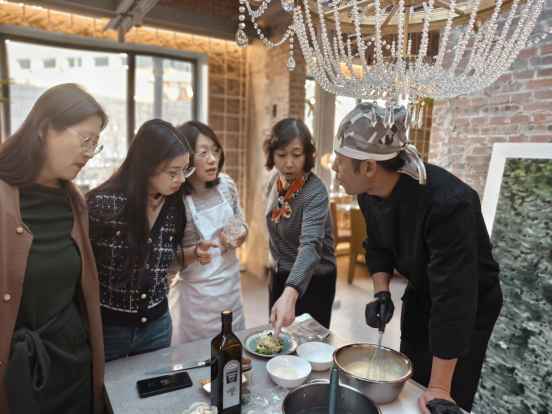 活动伊始,教职工们品尝了餐厅精心准备的碱水面包、独家大美酶面包,了解面包制作的原材料选配历程,并深入交流了对美食的见解与健康生活的感悟。随后,林伟旻技师为大家详细讲解了蔬菜沙拉酱、特色面包酱等健康酱料的具体做法,从如何选择健康原料、到各类食材的特性、再到调料的配比制作,不知不觉间一份色香味俱全的蔬菜沙拉就呈现在大家面前。他同时介绍了餐厅秉持“食药同源”的理念,其中四季养生面包的配方系由中国工程院院士张伯礼先生提供,经研发应用,在今年中银杯第十一届天津青年创青春大赛上喜得银奖。教职工们在品尝之余纷纷表示这些健康烹饪的小技巧既实用又贴心,在满足味蕾的同时亦无需担心对身体造成负担。